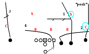 The quarterback's key of the near safety tells him what he's looking for. If he plays up he's throwing off him: if he takes the seam receiver, he throws the flat, if he takes the flat, he throws the seam. In any event, you usually tell the QB: "throw the seam, unless . . ."